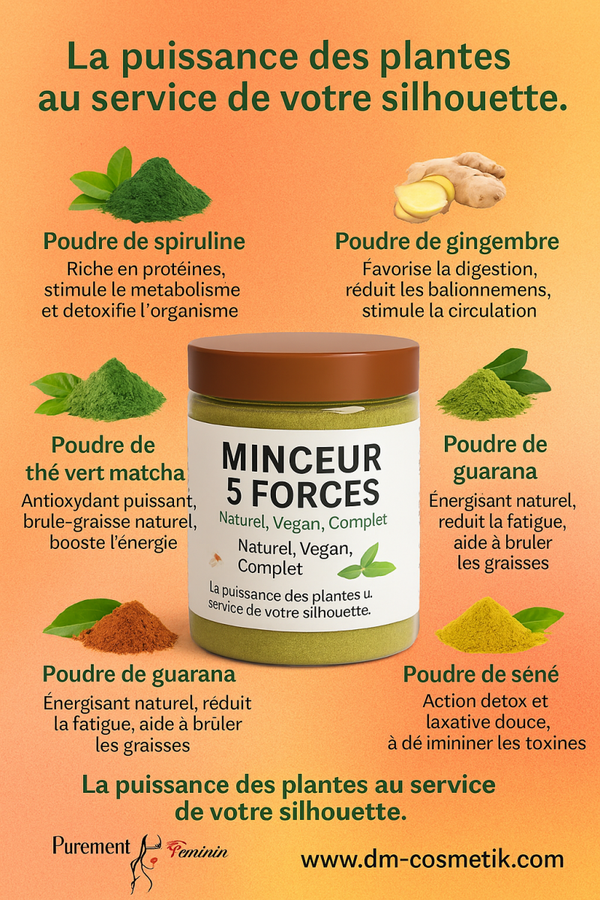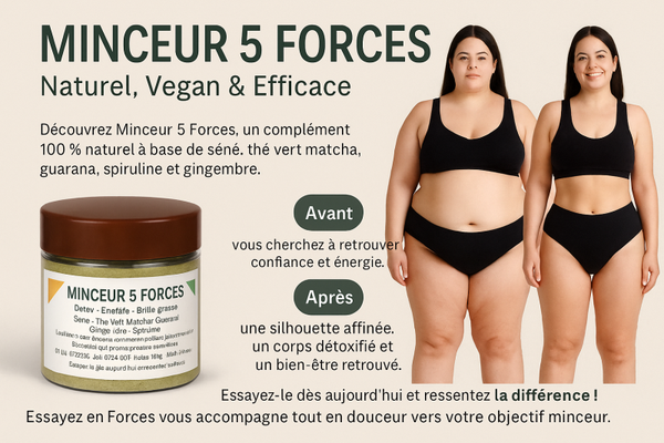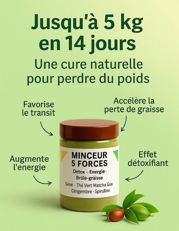 Découvrez Minceur 5 Forces, une formule 100 % naturelle conçue pour activer la combustion des graisses, favoriser l’élimination, réduire les ballonnements et contribuer à un ventre plat. Idéal pour les personnes sujettes à la constipation ou en quête de légèreté durable.